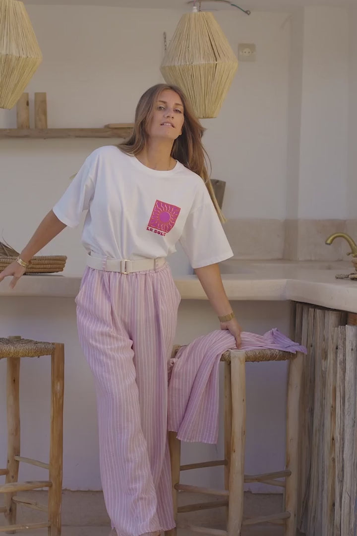 - Pair these wide-leg pinstripe pants with the matching blouse or a printed tee and make casual luxury your new go-to.