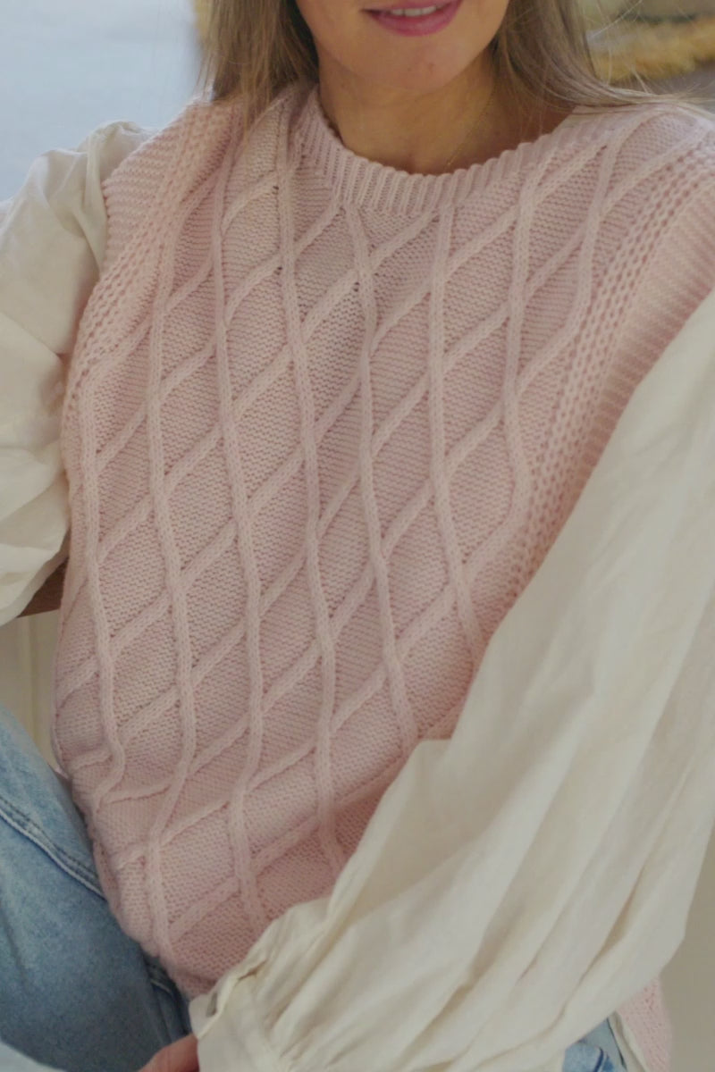 - Update your wardrobe in pretty, preppy layers with our Baby Pink Trellis Knit Sweater Vest.