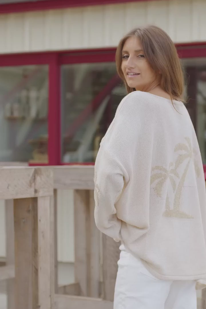 - Warm up on deck or at the shore in our Beige Intarsia Knit Gold Palm Sweater.