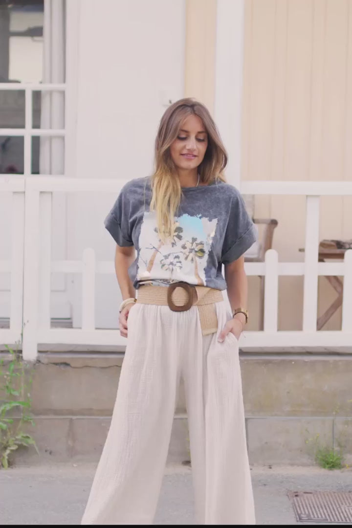 - Cream Textured Crinkle Cotton Gauze Pants.