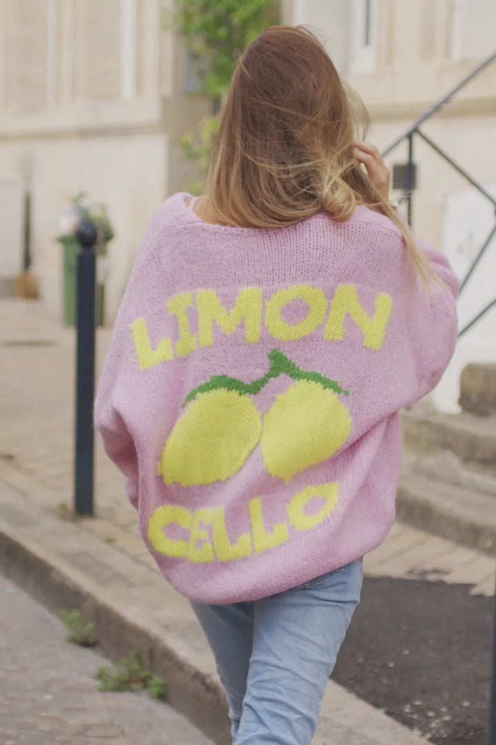- Light Pink Chunky Knit Cardigan with a yellow green lemon and 'limoncello' back pattern.
