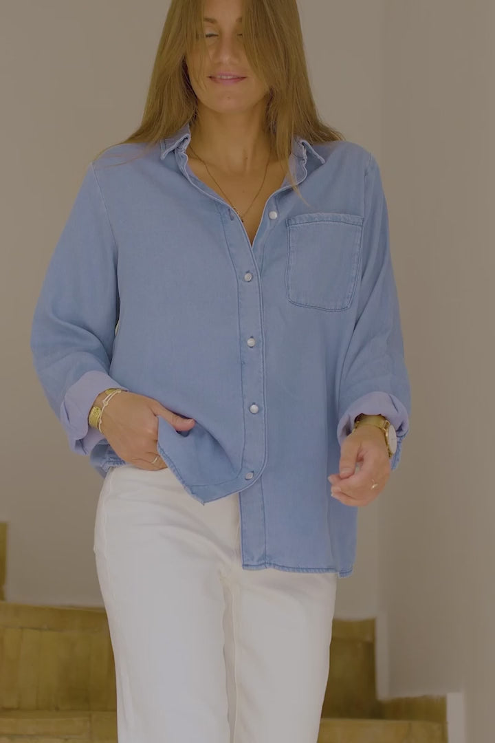 - Style this jean shirt inspired blouse with white denim or slacks or wear open over strappy tops and dresses for a wardrobe staple you’ll love to live in.