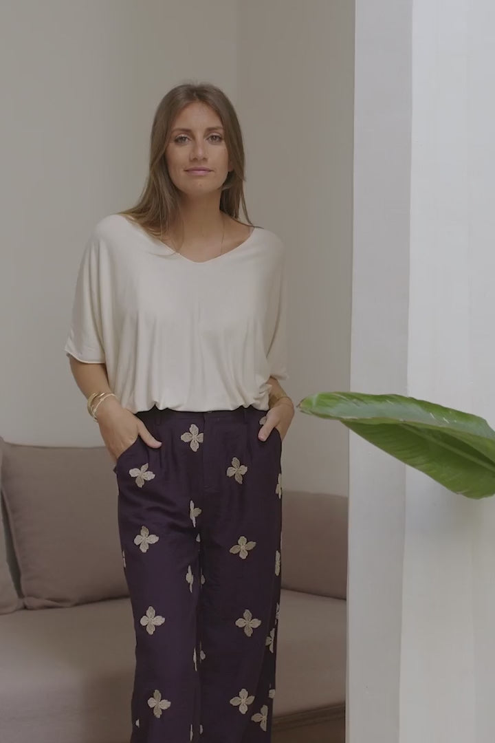 - Get a tailored look with a comfortable fit in our Navy blue Embroidered Viscose Pull-On Pants