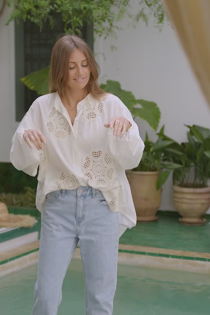 - Wear this pretty crochet cotton blouse tucked into your favorite jean shorts or vintage denim and make any day a little more sunny and sweet.