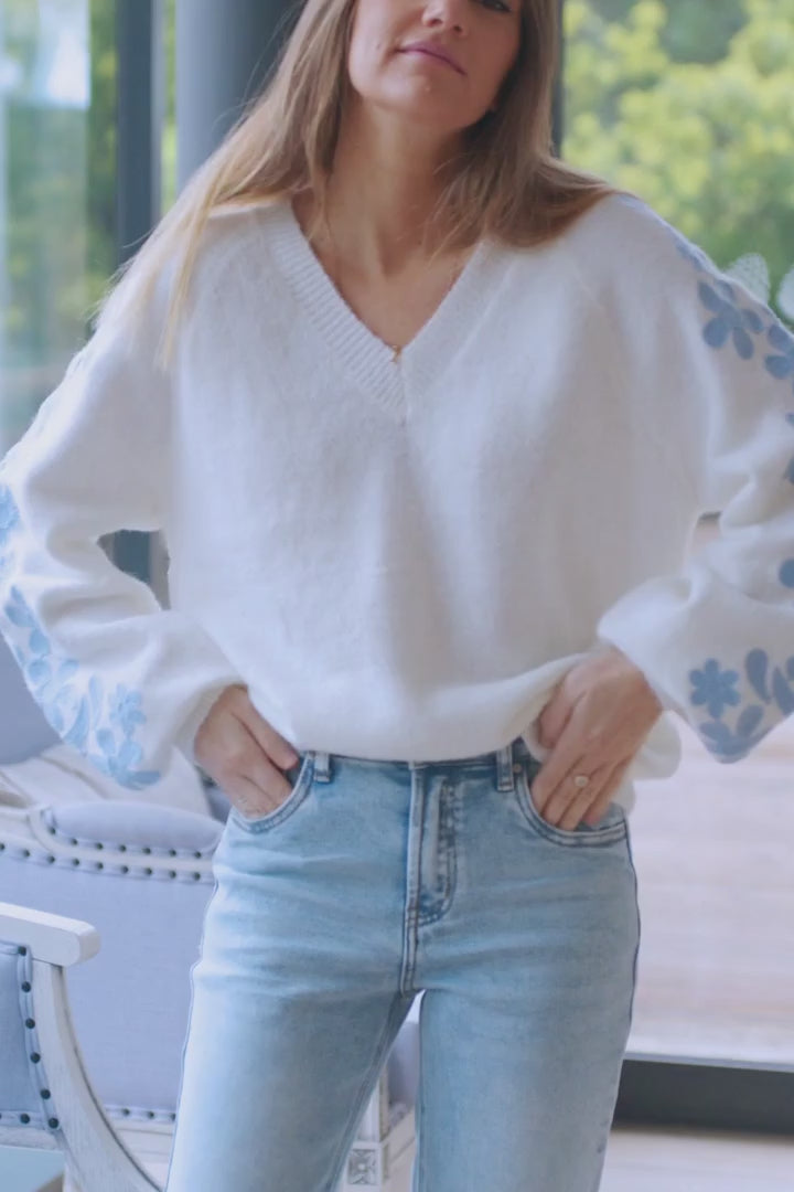 - Spring is in the air with our Off White Heathered Daisy Sleeve Sweater.