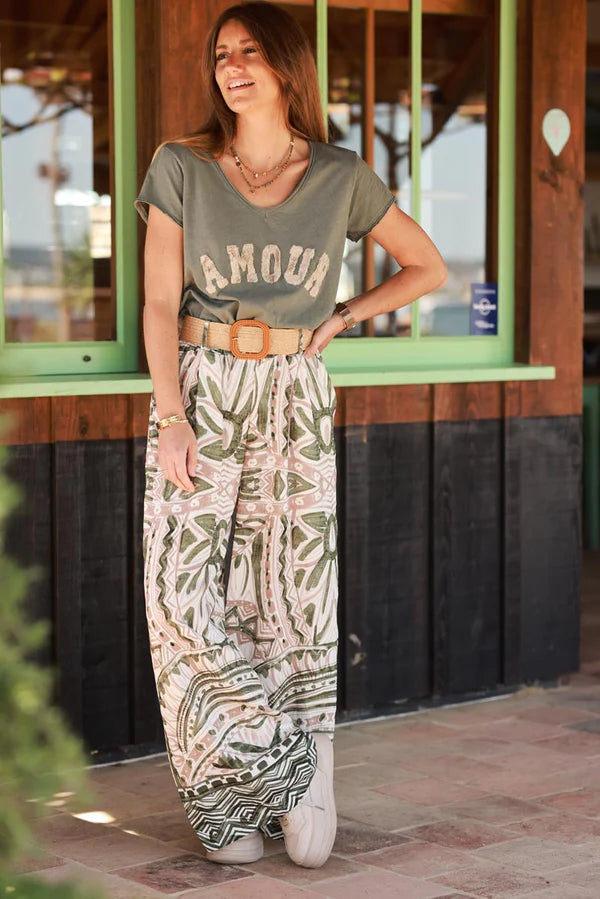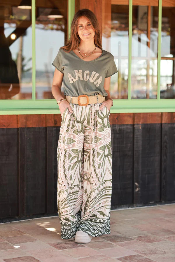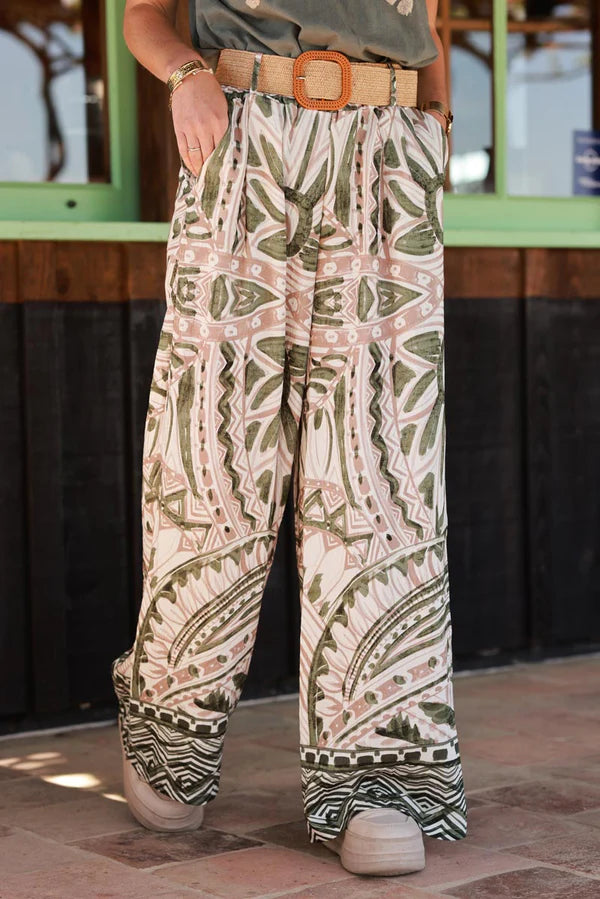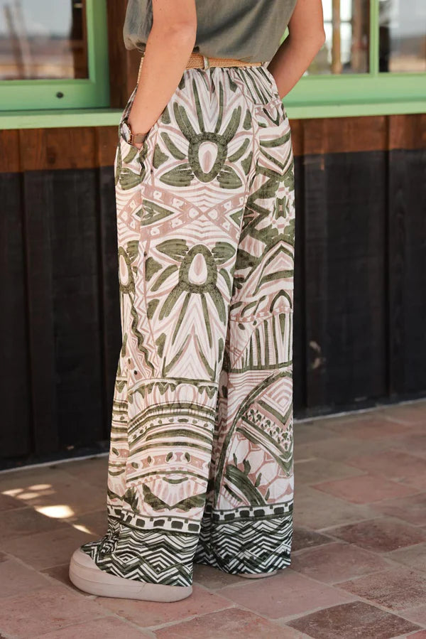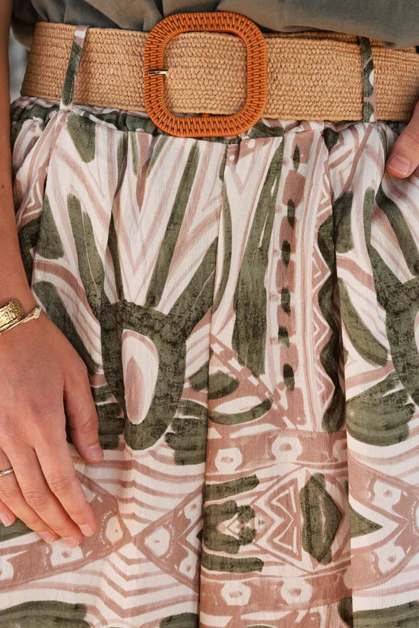 Olive Tiki Print Viscose Pull-On Pants + Belt included