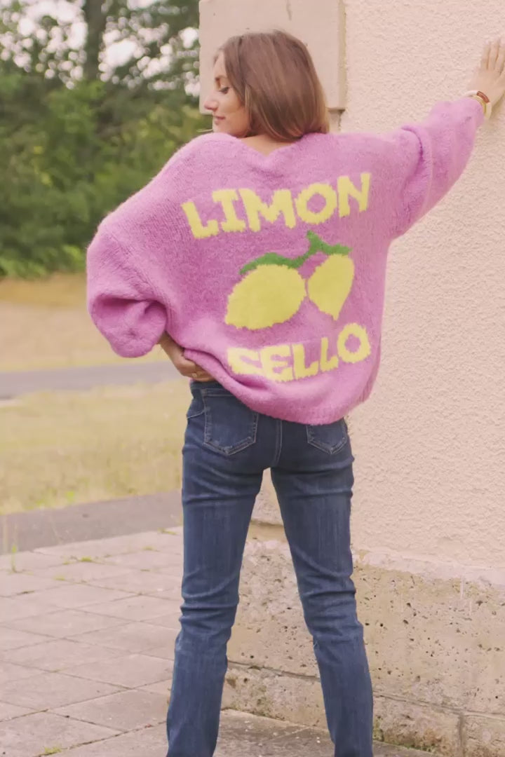 - Pink chunky knit cardigan with a yellow green lemon and 'limoncello' back pattern.