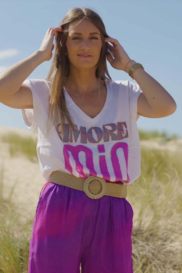 - Love your style and yourself in our White “Amore Mio” Slouchy V-Neck Tee.