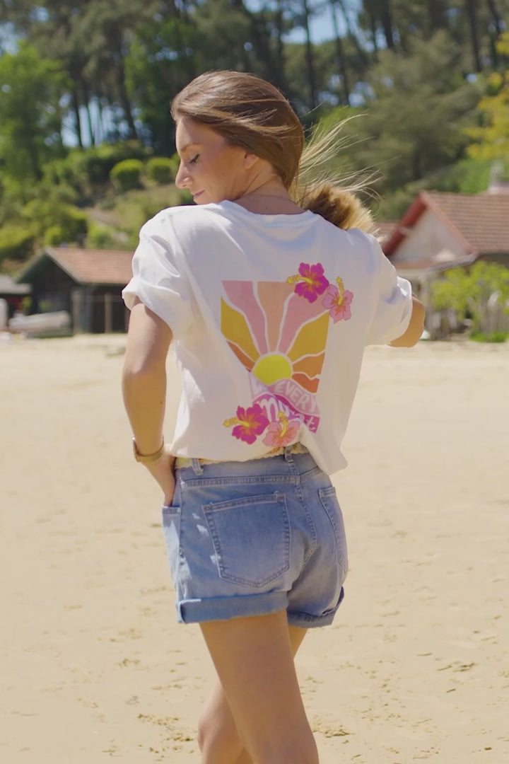 - Screen print hibiscus and “Enjoy Every Moment” sun and hibiscus motif on front and back.